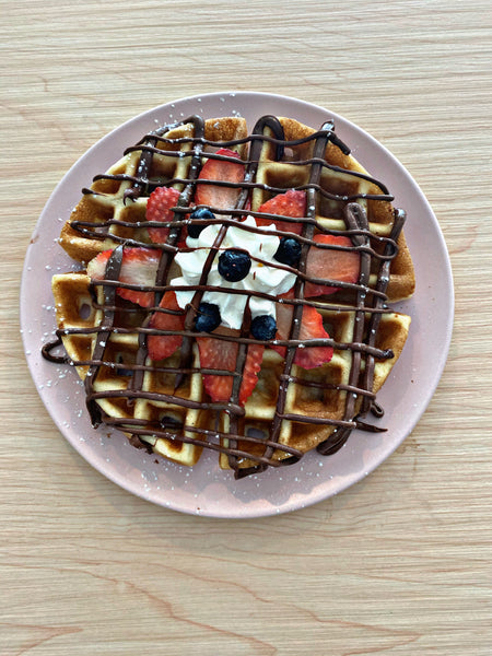 Nuestro delicioso waffle( con o sin Nutella) con frutas de temporada y crema batida.